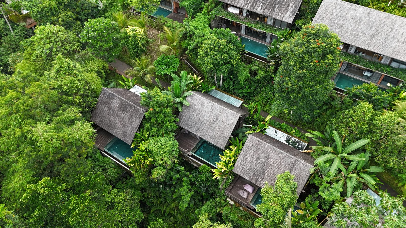A Serene Escape in the Heart of Ubud’s Nature Located approximately 8km from the main Tourist area of central Ubud this property is nestled among tropical greenery and Ubud’s cool highland air. It is where time slows down and every moment becomes intentional. Blending modern architecture with natural Balinese elements, this tranquil retreat offers private pool villas designed for romance, family connections, or soulful solitude.